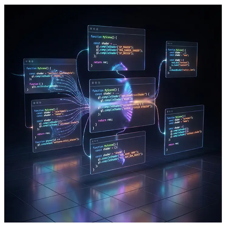 “Render uploaded React + WebGL shader code as a 3D scene: floating UI, shader effects, color gradients. Preserve code structure visually in the environment.”